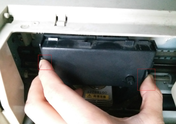 6、現在把色帶架裝回打印機,同樣要對準卡槽位子及色帶與打印頭的位子。裝回以后,開啟電源。然后我們打印一張測試頁,看到的打印出來的效果和新機器無恙的話,就更換成功了!